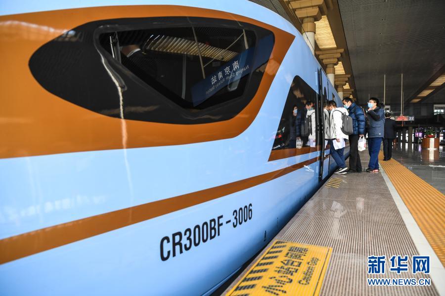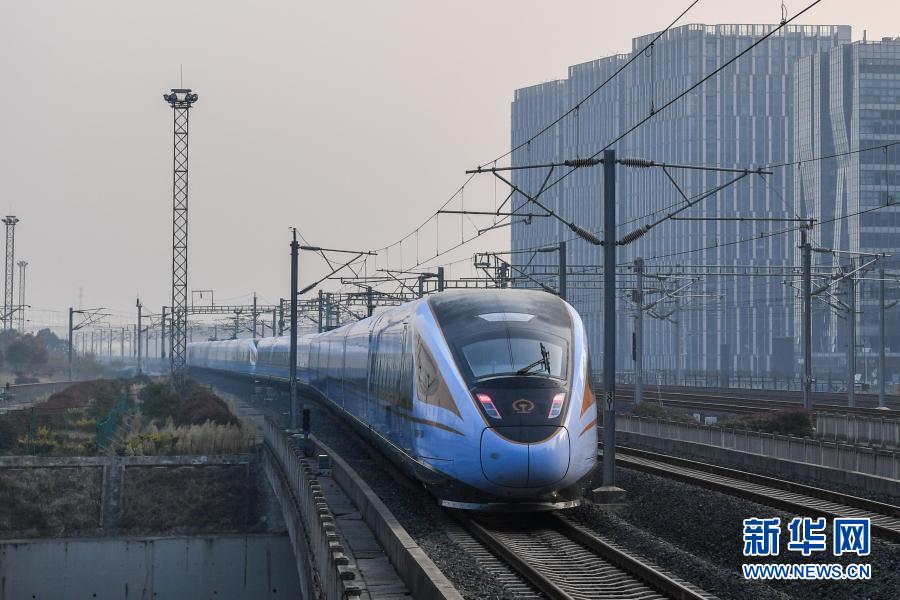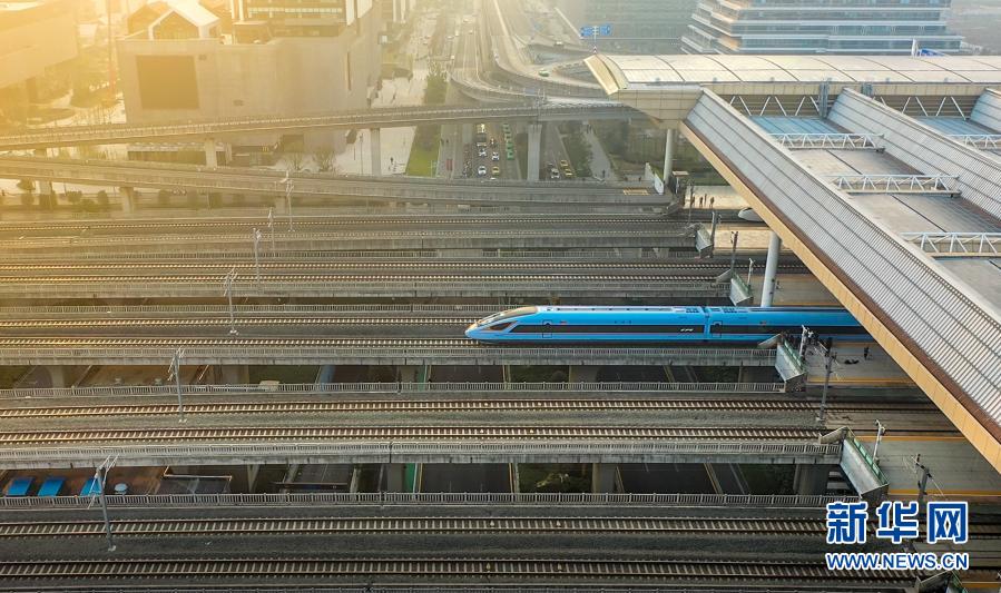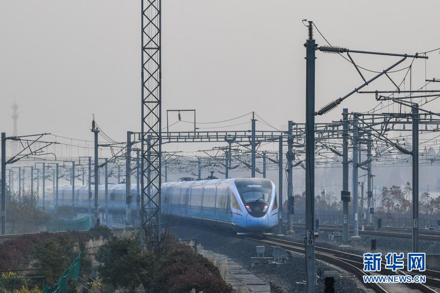 12月24日,由CR300BF型“復興號”動車組擔當的C3887次列車駛出南京南站。新華社記者 李博 攝
