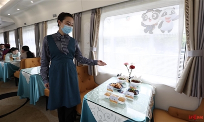 在列車服務(wù)上,“熊貓專列”全面推行了“點對點,個性化”定制服務(wù),除提供日常列車乘務(wù)外,還引進了星級賓館“黃金管家”服務(wù)模式,專門配備“熊貓管家”,實現(xiàn)了工作人員固定車廂和全列流動相結(jié)合的全方位服務(wù)。為滿足旅游團隊出行個性化需求,“熊貓專列”還可提供下午茶會、主題歌會、雞尾酒會等定制服務(wù)。