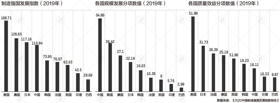 數據顯示,2019年,制造強國發展指數從高到低依次為美國、德國、日本、中國、韓國、法國、英國、印度、巴西。美國位于第一陣列,德國、日本位于第二列陣,中國、韓國、法國、英國位于第三陣列。從各分項指數來看,“規模發展”仍是中國制造強國進程中的主要支撐力。