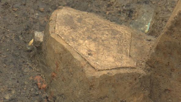 8號坑最新暴露出來的青銅碎片,主要集中在坑的南部,而坑的中部,目前以紅燒土快、石板等建筑構件居多,專家介紹,這種布局,反映出當時古蜀人有意識的一種填埋行為。