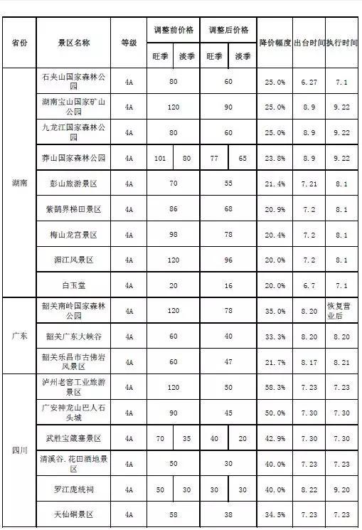 降價(免費開放)景區33個,已出臺28個、擬出臺5個。涉及5A級景區10個、4A級20個、3A級3個。其中,免費開放景區3個;降價景區30個,降幅在20-30%之間的2個。