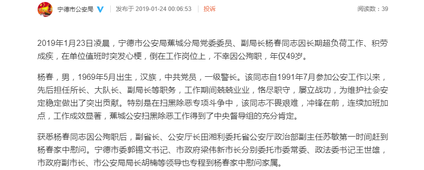新京報快訊 據福建省寧德市公安局官方微博消息,2019年1月23日凌晨,寧德市公安局蕉城分局黨委委員、副局長楊春同志因長期超負荷工作、積勞成疾,在單位值班時突發心梗,倒在工作崗位上,不幸因公殉職,年僅49歲。