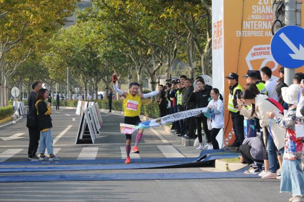 上海國際企業半馬比賽中,選手沖線。