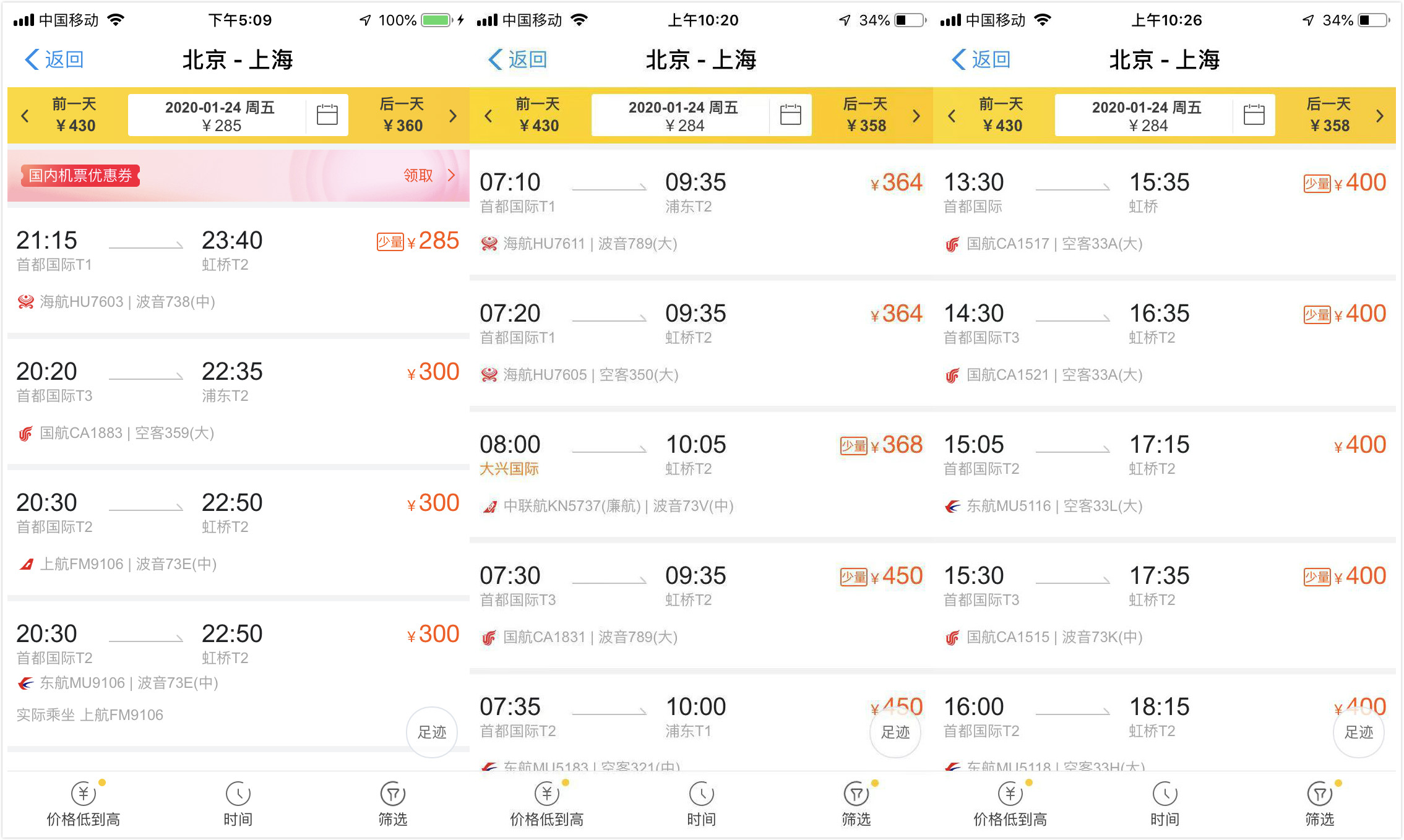 除夕(1月24日)當(dāng)天,鐵路“12306”APP顯示,北京-上海高鐵二等座價(jià)格區(qū)間為553-558元,中新經(jīng)緯客戶端通過第三方售票平臺(tái)發(fā)現(xiàn),北京—上海多架航班機(jī)票經(jīng)濟(jì)艙價(jià)格在300-400元,其中,海航HU7603航班機(jī)票經(jīng)濟(jì)艙價(jià)格僅285元,比553元的二等座高鐵票便宜近一半。