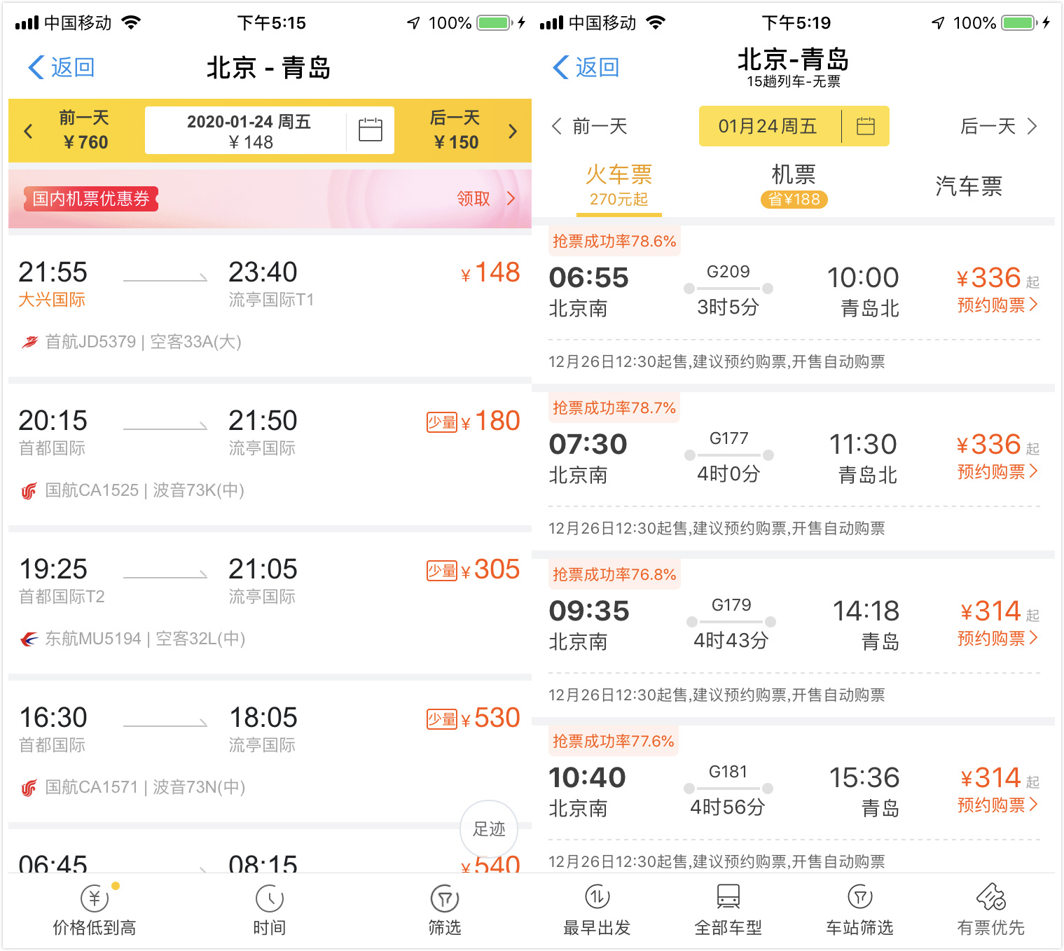北京-青島高鐵二等座價(jià)格區(qū)間為314-336元,首航JD5379航班經(jīng)濟(jì)艙機(jī)票價(jià)格為148元,比高鐵二等座價(jià)格便宜一半還多;國航CA1525航班經(jīng)濟(jì)艙機(jī)票價(jià)格為180元,比高鐵二等座價(jià)格便宜近五成。