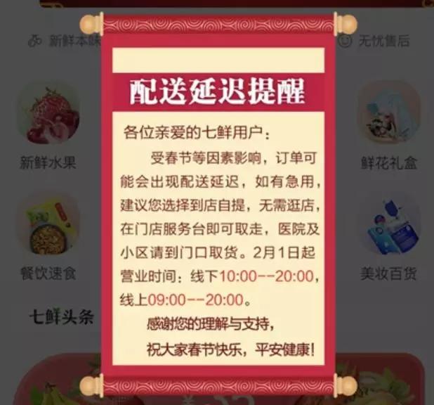 盒馬在APP上也提醒鼓勵用戶去門店自提,稱門店供應(yīng)充足,到店安心選購。七鮮APP發(fā)延遲送貨公告,如有急用,建議到店自提,無需逛店,在門店服務(wù)臺即可取走。