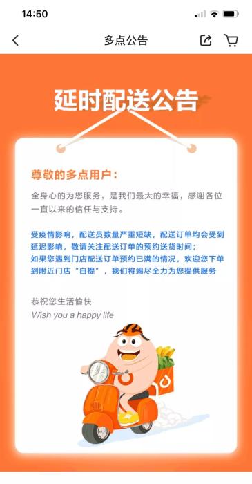 多點制定了配送調(diào)整方案及復(fù)工方案顯示,北京地區(qū)80%門店會陸續(xù)恢復(fù)當日送達標準,建議用戶當日盡早下單,以免門店小哥被約滿,如果配送小哥顯示已經(jīng)約滿,可以APP選購后到門店自提。