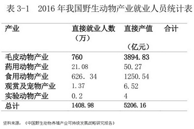 根據(jù)調(diào)查估算,2016年,全國野生動(dòng)物養(yǎng)殖產(chǎn)業(yè)的專兼職從業(yè)者有1409多萬人,創(chuàng)造產(chǎn)值5206多億元人民幣。其中,毛皮動(dòng)物產(chǎn)業(yè)從業(yè)者約760萬人,毛皮產(chǎn)業(yè)產(chǎn)值估算3894.83億元;藥用動(dòng)物產(chǎn)業(yè)的從業(yè)者約21.08萬人,創(chuàng)造產(chǎn)值50.27億元;食用動(dòng)物產(chǎn)業(yè)的從業(yè)者約626.34萬人,創(chuàng)造產(chǎn)值1250.54億元;觀賞、寵物類產(chǎn)業(yè)的從業(yè)者約1.37萬人,創(chuàng)造產(chǎn)值6.52億元;實(shí)驗(yàn)靈長類動(dòng)物產(chǎn)業(yè)直接從業(yè)者約2000人,創(chuàng)造產(chǎn)值4億元。