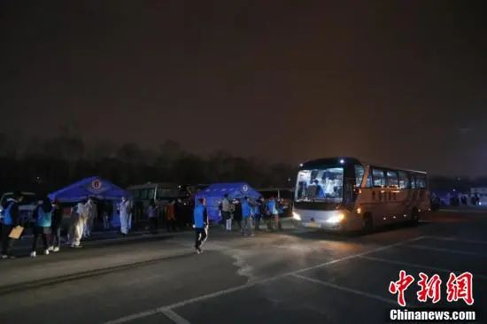運(yùn)送旅客的大巴車到達(dá)朝陽區(qū)轉(zhuǎn)運(yùn)中心,各街道和社區(qū)分別在不同的帳篷中接待離鄂返京人員。中新社記者 賈天勇 攝