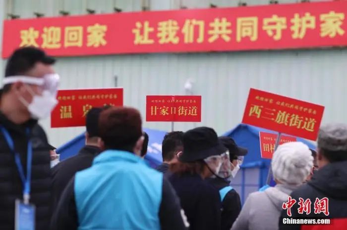 3月25日,北京市海淀區(qū)區(qū)級集中分流點(diǎn),街鎮(zhèn)工作人員舉牌迎接離鄂返京人員抵達(dá)。中新社記者 盛佳鵬 攝