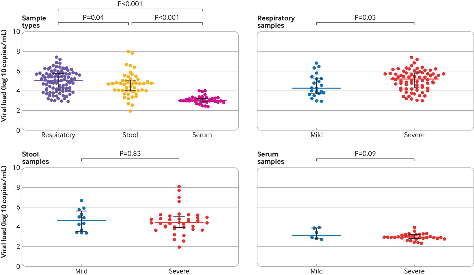 此外,嚴重疾病患者的呼吸道樣本中病毒的持續(xù)時間明顯長于輕度疾病患者;而輕度患者和重度患者的糞便和血清樣本中的病毒載量無顯著差異。