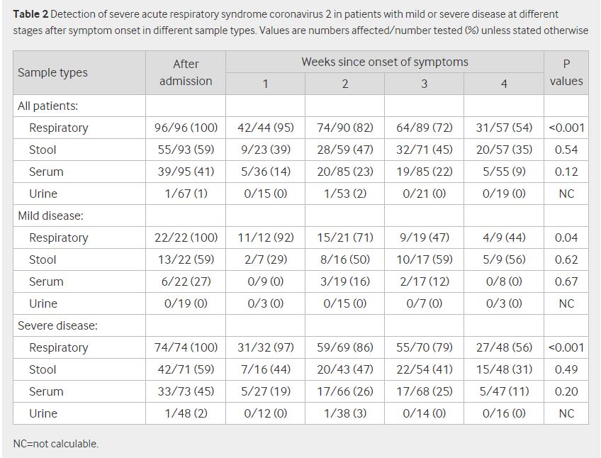 與重癥患者呼吸道樣本中的病毒載量變化趨勢類似,在疾病發(fā)作后的第三和第四周,患者糞便樣本的病毒載量最高。