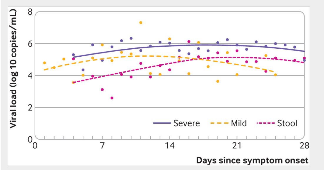 通過局部加權(quán)回歸分析,研究人員發(fā)現(xiàn),在輕癥組中,疾病發(fā)作的第二周開始,患者呼吸道樣本中的病毒載量達到峰值;而在重癥組中,患者呼吸道樣本中的病毒載量在第三、四周中繼續(xù)升高。