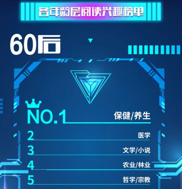 當(dāng)當(dāng)還統(tǒng)計(jì)了各年齡層的閱讀興趣,看上去十分符合實(shí)際。60后基本已經(jīng)把孩子送進(jìn)大學(xué),已退休或即將退休的他們肯定注重養(yǎng)生,70后屬于中小學(xué)家長(zhǎng)的主力軍,而80后的孩子多數(shù)還處于低幼階段。進(jìn)入社會(huì)不久的90后面臨心靈世界的重建,而00后還可以無(wú)憂無(wú)慮地沉浸在自己的世界中。
