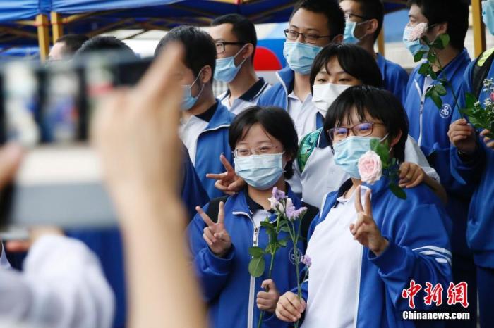 資料圖:7月10日,北京第八十中學(望京校區(qū))高考考點外,北京朝陽外國語學校的考生們合影。當日,為期4天的北京地區(qū)2020年高考結束。 中新社記者 韓海丹 攝