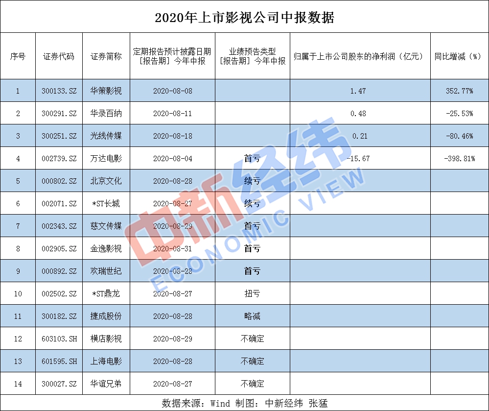 Wind數(shù)據(jù)顯示,截至8月19日,在20家影視相關(guān)上市公司中,已有14家公司發(fā)布半年報或半年度業(yè)績預告,其中6家公司虧損,4家盈利(2家凈利潤大幅下滑),一家業(yè)績略減,三家業(yè)績不確定。