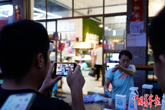 網(wǎng)紅店鋪門前的一塊空地上,每天都會聚集一群舉著手機(jī)的“拍客”,他們圍成一圈,一絲不茍地對著中間的表演者拍攝。