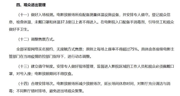 需要指出的是,雖然影院上座率上調(diào)到75%,但具體由各省級(jí)電影主管部門在當(dāng)?shù)匾咔榉揽夭块T指導(dǎo)下,進(jìn)行動(dòng)態(tài)調(diào)整。對(duì)觀眾而言,仍需要采用網(wǎng)絡(luò)實(shí)名預(yù)約、無接觸方式購(gòu)票,在觀影過程中也需要遵守防疫規(guī)定,如登記、查體溫、觀影過程中佩戴口罩等等。