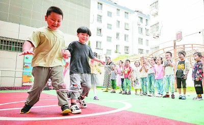 江蘇省淮安市清江浦區(qū)新民路幼兒園,小朋友在進(jìn)行綁腿跑游戲。新華社發(fā)