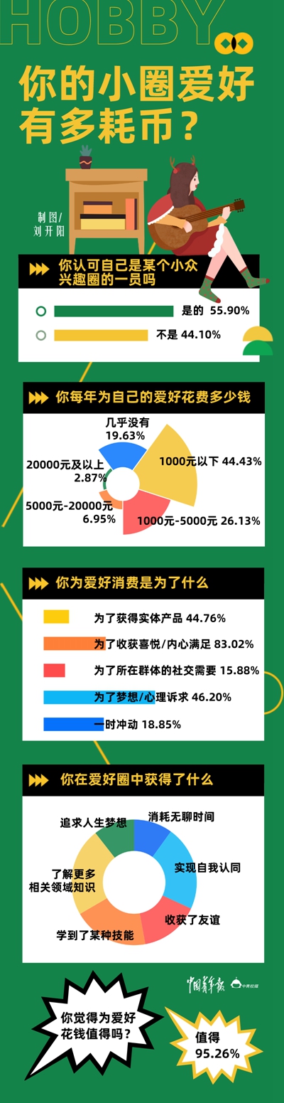 “Z世代以興趣劃圈,圈層文化的消費(fèi)潛力也在不斷展現(xiàn)。在以電競(jìng)、二次元、模玩手辦、國(guó)風(fēng)為代表的圈層文化消費(fèi)市場(chǎng)中,Z世代占據(jù)主力?!盋BNData《2020Z世代消費(fèi)態(tài)度洞察報(bào)告》這樣寫(xiě)道。中青校媒就“Z世代圈層文化的消費(fèi)現(xiàn)象”面向全國(guó)907名大學(xué)生展開(kāi)問(wèn)卷調(diào)查,結(jié)果顯示,69.72%被調(diào)查者會(huì)為自己所在的興趣圈消費(fèi),其中,44.43%受訪大學(xué)生每年在愛(ài)好上支出幾百至千元不等,35.94%每年花費(fèi)超過(guò)1000元,也有19.63%幾乎不花錢(qián)。
