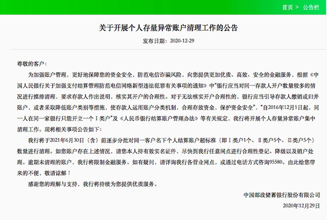 郵政儲蓄銀行公告顯示,將于2021年6月30日(含)前逐步分批對同一客戶名下個人結算賬戶超標準(即Ⅰ類戶1個、Ⅱ類戶5個、Ⅲ類戶5個)數量進行清理。如賬戶存在上述情況,本人持有效實名證件,盡快到該行任意網點進行合理性登記、降級以及銷戶處理。逾期未清理的賬戶,該行將限制金融服務。