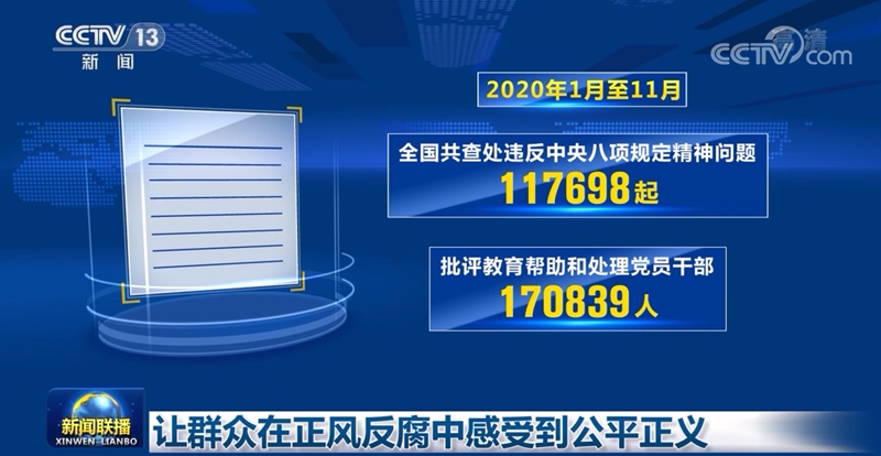 從一件件小事入手,努力提升群眾獲得感、幸福感、安全感。2020年,紀檢監察機關緊緊圍繞貫徹新發展理念、實現高質量發展、打好三大攻堅戰等加強監督檢查,大力整治不擔當、不作為、亂作為、假作為,嚴肅查處形式主義、官僚主義以及弄虛作假等作風問題,督促黨員干部在收官之年改作風、勇作為、抓落實。逢節必令,違紀必查,點名道姓通報曝光。2020年1至11月,全國共查處違反中央八項規定精神問題117698起,批評教育幫助和處理黨員干部170839人。