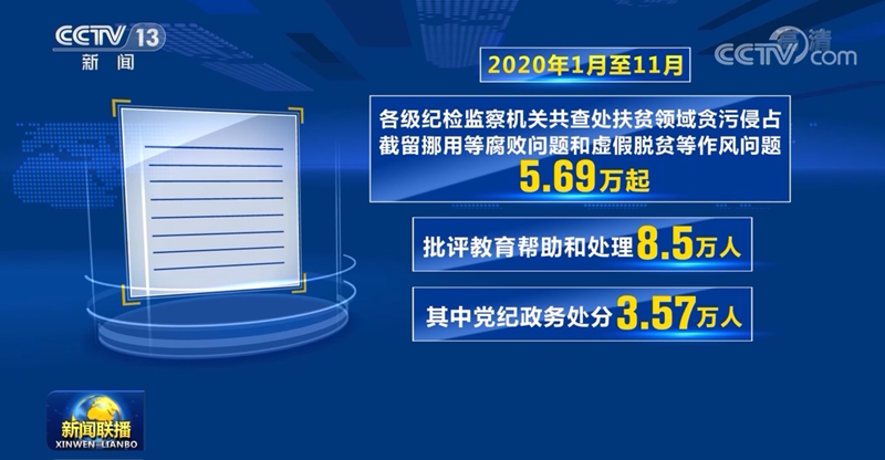 2020年1月至11月,各級紀檢監察機關共查處扶貧領域貪污侵占、截留挪用等腐敗問題和虛假脫貧等作風問題5.69萬起,批評教育幫助和處理8.5萬人,其中黨紀政務處分3.57萬人。