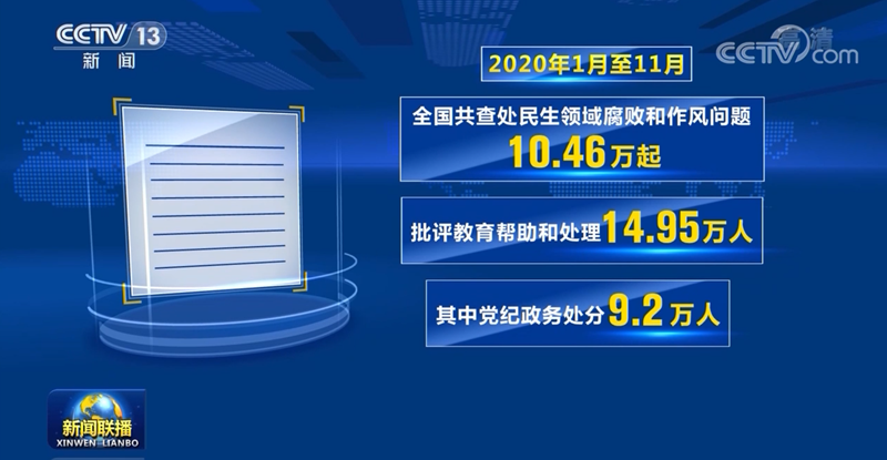與此同時,各級紀檢監察機關深入開展民生領域損害群眾利益問題集中整治,持續糾治教育醫療、就業創業、養老社保、環境保護等領域腐敗和作風問題,保障人民合法權益,推動解決群眾“急難愁盼”事。2020年1月至11月,全國共查處民生領域腐敗和作風問題10.46萬起,批評教育幫助和處理14.95萬人,其中黨紀政務處分9.2萬人。