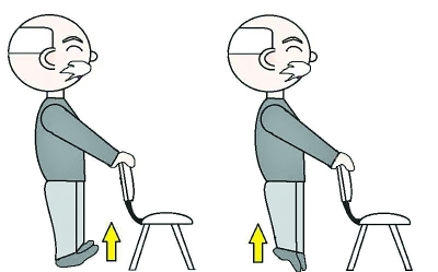 挺直站立,手扶椅背,前后晃動(dòng)身體,腳尖與腳跟循環(huán)著地以鍛煉下肢肌肉,達(dá)到控制重心的目的。身體晃動(dòng)幅度不要過大,腳尖/腳跟與地面呈30度角度。