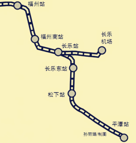 福平鐵路始于福州站,經鼓山、福州南站、長樂、松下,以橋梁跨越海壇海峽人嶼島、小練島、大練島至平潭島,線路長度約88.5公里。全線設福州、福州南、長樂(首占)、長樂東(古槐)、松下、平潭共6座車站,其中福州、福州南為既有站,其余為新設站。