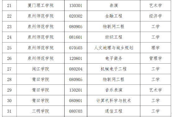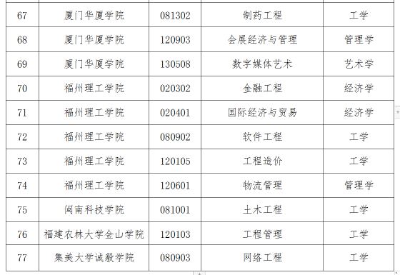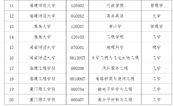 根據福建省學位委員會、福建省教育廳《關于調整學士學位授權專業增列審核工作的通知》(閩學位〔2015〕4號)和《關于2016年高等院校增列學士學位授予單位和授權專業審核工作有關事項的通知》(閩學位辦〔2016〕9號)精神,在院校自行審核申報基礎上,省學位辦根據有關文件精神進行了認真復核,經研究,同意廈門大學等26所院校的西班牙語等77個本科專業增列為學士學位授權專業?,F予以公布。