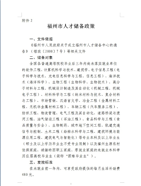 (一)入住畢業生符合福州市人才儲備條件的,可向福州市人事人才中心申請納入福州市人才儲備,并給予相應生活補助。(附件2)