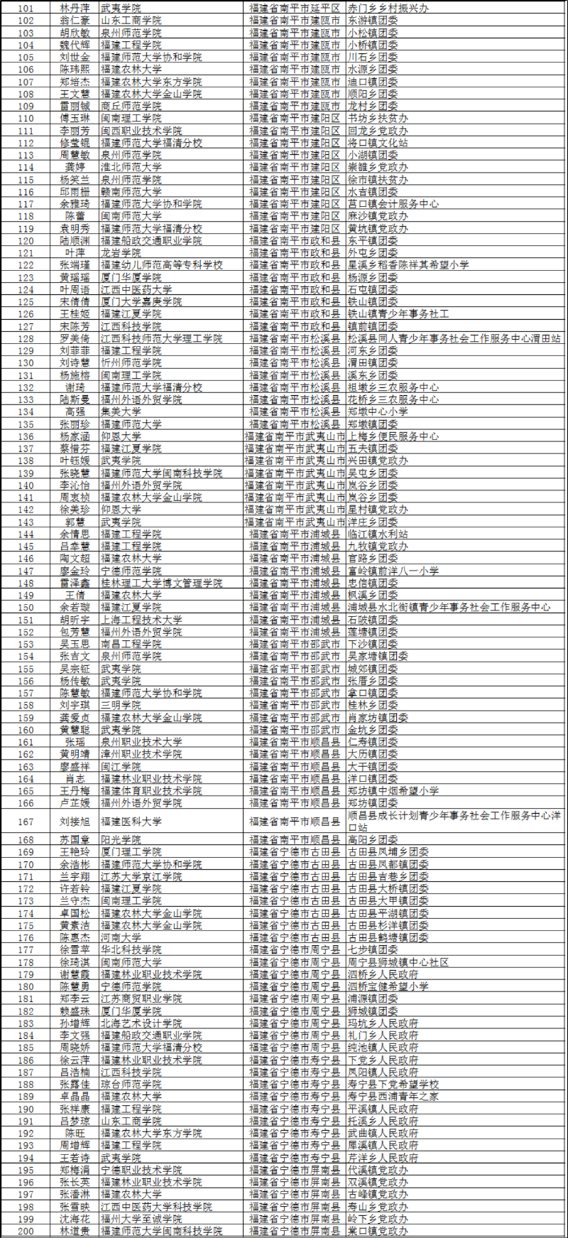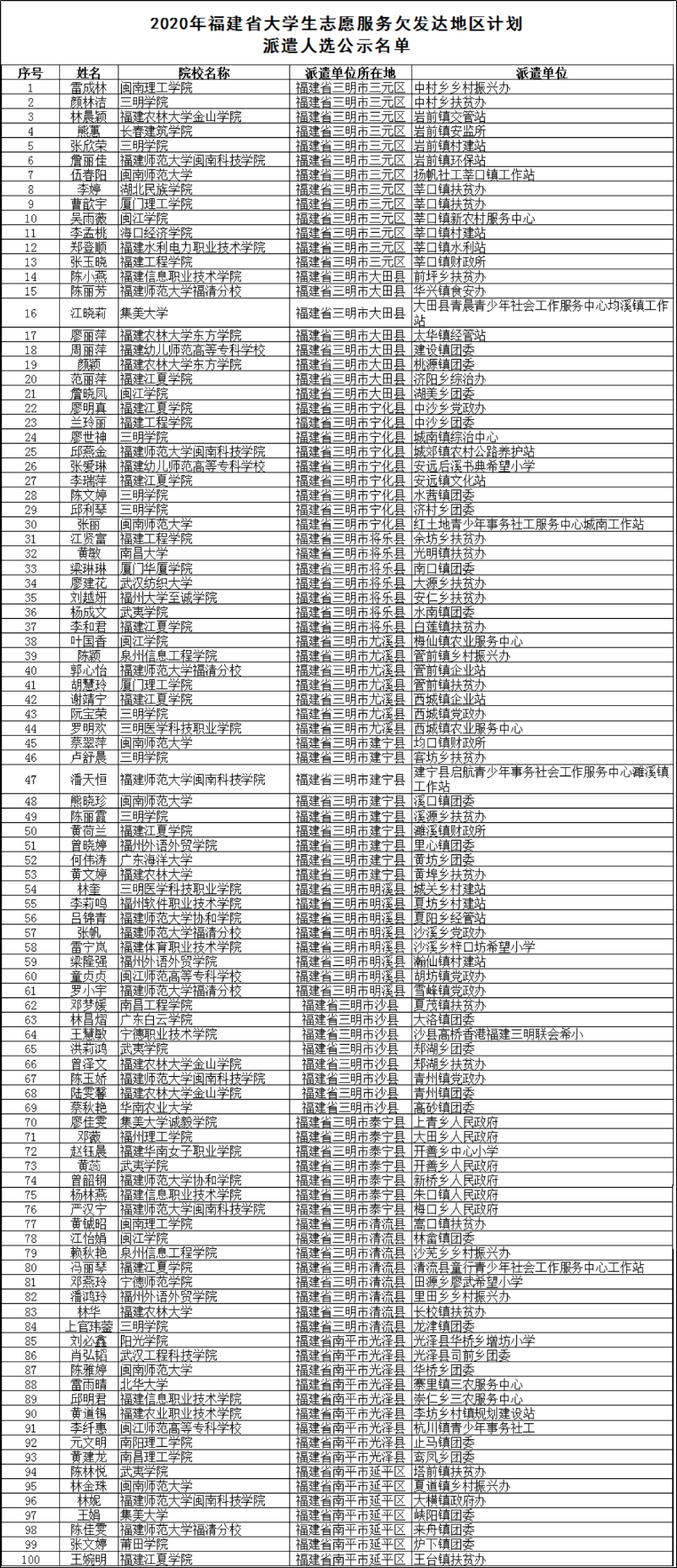 東南網7月15日訊 15日,福建省畢業生就業創業公共服務網發布名單公示。根據《2020年福建省大學生志愿服務欠發達地區計劃實施方案》(閩大學生志愿辦〔2020〕4號)相關規定,經過各高校、各地市審核、評分、體檢等環節,并經省“欠發達地區計劃領導小組”同意,最終錄選300名2020屆大學生志愿者參加欠發達地區計劃。