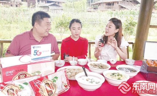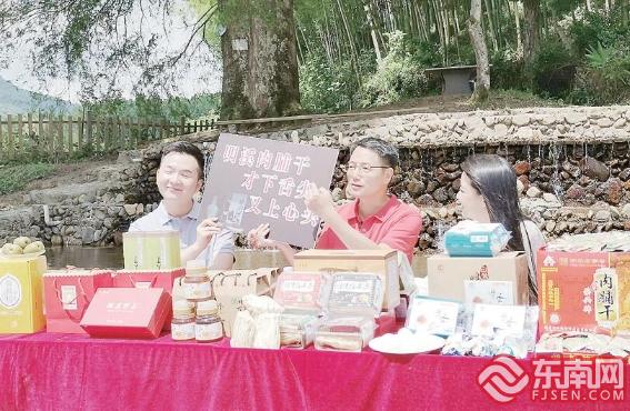 7月18日上午,“助力脫貧攻堅 老區蘇區直播帶貨行”第三場活動走入三明明溪。明溪縣副縣長林建忠(上圖中)、副縣長王鳳珍(下圖中)推介當地農特產品。東南網記者 陳艷艷 劉惠萍 攝