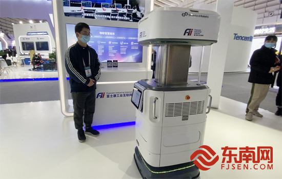 在富士康展區,由一臺防疫消殺機器人正在向大家演示工作流程。該款移動復合消毒機器人以激光SLAM移動機器人為平臺,高度集成紫外照射、干霧發生及噴灑、過濾集塵殺菌等功能模塊,能快速有效地對室內場景進行復合消毒殺菌作業。機器人配備消毒任務管理系統,可根據客戶實際消毒作業流程自定義消毒任務,預約全自動消毒作業,全程標準化可控制且可追溯。該項目研發單位斯坦德機器人深圳有限公司的項目經理白鵬強告訴記者,該機器人搭配基于5G網絡通訊的視覺檢測系統,實現消殺過程的實時高清記錄、特征目標高效識別及機器人行為的動態決策。移動復合消毒機器人可廣泛適用于醫院、酒店、商場、學校、機場碼頭等公共場所,可實現自動充電,7*24小時穩定安全運轉,更高效承擔相應的工作內容,降低人員暴露風險提高工作效率、減輕相關崗位人員的工作壓力。