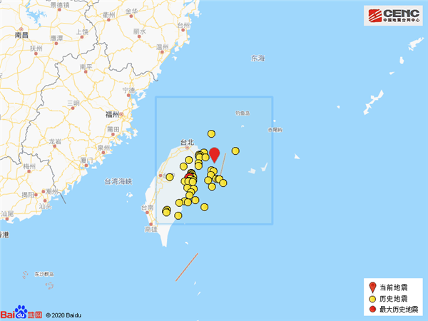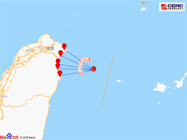 速報參數:據中國地震臺網正式測定,2月7日1時36分在臺灣宜蘭縣海域發生5.2級地震,震源深度70千米,震中位于北緯24.65度,東經122.50度,距臺灣島約61公里。