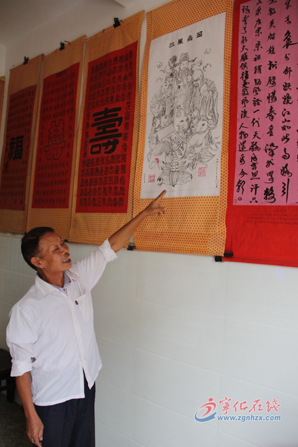 ??? 寧化縣中沙鄉中沙村,是一個偏僻的小山村,祖祖輩輩種田為生,似乎與藝術搭不上邊,但走進村民廖發志簡陋的家中,一股淡淡的墨香迎面撲來,只見大廳內滿墻都是主人創作的書畫作品,琳瑯滿目,令人賞心悅目。