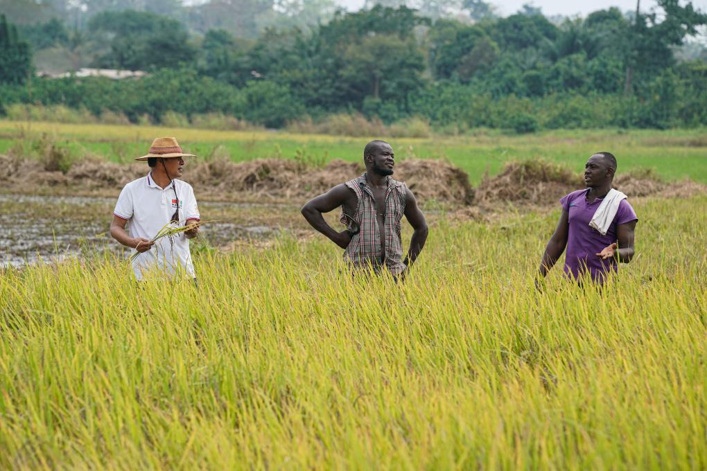 1月8日,在科特迪瓦迪沃省格格杜墾區(qū),中國援科農(nóng)業(yè)技術(shù)合作組組長郭長友(左)與稻農(nóng)交流。新華社記者韓旭攝