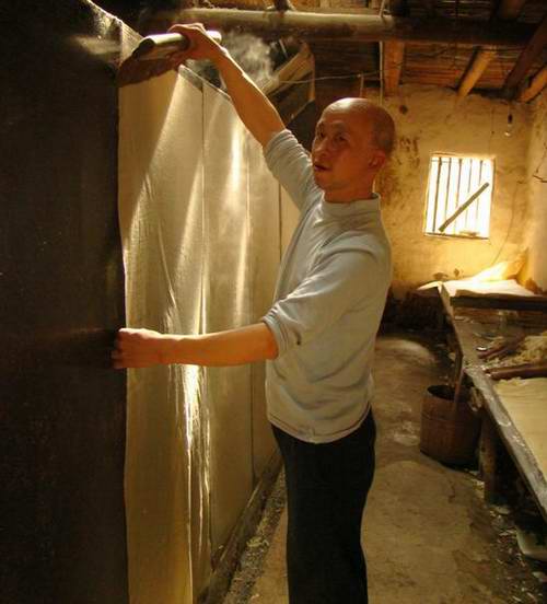最后,把紙送入焙烤房烘干。因?yàn)闇囟雀撸杭垘煾刀脊庵蜃痈苫睢1杭埞び盟⒆影褖λ瘢珠_濕紙,按順序一張張貼在焙壁上,當(dāng)他回到第一張紙前,濕紙正好蒸去水分,變成干紙,一張張揭下。如此往復(fù)循環(huán),一天下來(lái),兩人剛好能把10刀紙烘干。