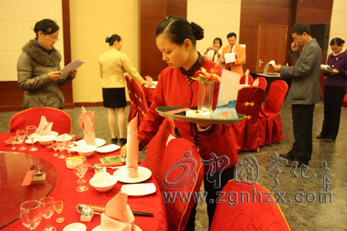 ???? 上午8:30,比賽正式開(kāi)始,來(lái)自天鵝大酒店、含笑大酒樓、深海魚(yú)等8家酒店、酒樓的24名參賽選手以3人一組,每組限時(shí)14分鐘的形式展開(kāi)競(jìng)技。在比賽中,參賽選手?jǐn)[碗碟、放杯盞、疊餐巾,姿態(tài)優(yōu)雅、秩序井然。只見(jiàn)餐桌上一個(gè)個(gè)骨碟定位均勻;餐碟和筷子擺放講究,位置整齊;餐巾花式各異,形狀挺拔。選手們認(rèn)真的態(tài)度,嫻熟的技能,精彩的表現(xiàn)贏得了評(píng)委們的一致好評(píng)。