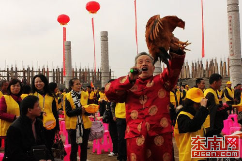 具有客家特色的祭祖方式:司儀手持雄雞,旁人喝彩
