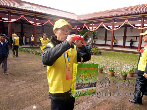 ??? 上午8時許,來自世界各地的客家鄉賢紛紛步入會場。在人群中,一位來自江西贛州客聯會的老人引起了記者的注意,他一走下車便拿起手中系著紅絲帶的鎖吶,吹起了歡快喜慶的樂曲。只見他鼓起兩腮,十指不停地配合演奏,忽高、忽低、忽遠、忽近的鎖吶聲源源不絕,歡快喜慶的曲調彌漫在客家祖地上空。