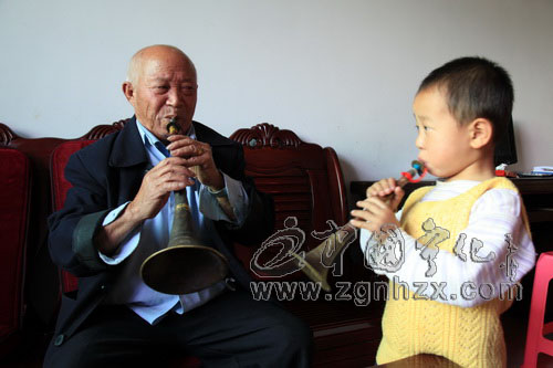 今年81歲的“嗩吶王”伊遠(yuǎn)恢向5歲的曾孫示范