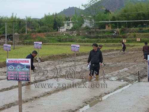 連日來,寧化縣河龍鄉農技站站長曾仁杰指導農民在河龍貢米品種篩選基地播種。