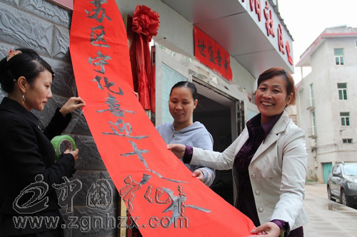 11月7日,福建省寧化縣翠江鎮朝陽社區工作人員喜貼對聯,祝福黨的十八大隆重開幕。連日來,該縣各基層黨組織通過懸掛橫幅、張貼宣傳標語、在戶外電子屏播放宣傳標語等形式,營造濃厚氛圍喜迎十八大。(張瑞蘭 攝)