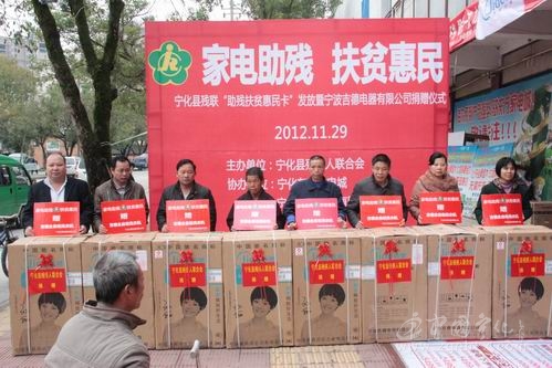??? 據了解,此次活動,浙江寧波吉德電器有限公司共捐贈8臺洗衣機,價值9600元。其中,寧化縣特殊教育學校和泉上福樂家園各一臺,特困殘疾人6臺,并送貨上門。該公司還向全縣持證殘疾人發放“助殘扶貧惠民卡”10000多張。持有“愛心扶殘卡”的殘疾人可購買洗衣機和彩電各優惠400元、電冰箱優惠500元。殘疾人持身份證、殘疾證、“助殘扶貧惠民卡”在東方家電城采購廠家指定扶殘專供產品,還可享受多重優惠。(張彩華)