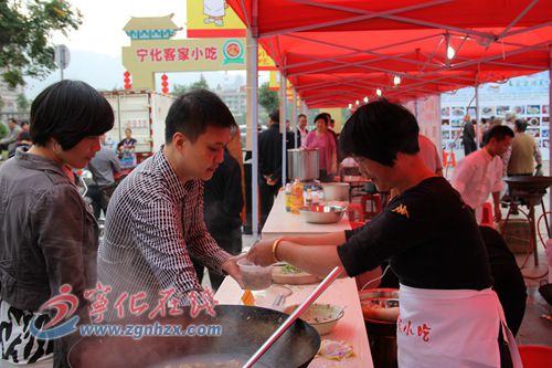 ??? 展館廣場南側,兩座客家牌樓巍然屹立,周邊采用剪紙藝術鑲嵌客家文化元素,展示寧化源遠流長的客家文化和豐富的原生物產。牌樓下,大紅燈籠高高掛,寧化客家小吃一條街濃香四溢,燒麥、擂茶、勺子粉、松丸子等小吃業主同場競技,一展風姿,過往群眾紛紛駐足觀看,禁不住坐下來細細品味“舌尖上的美味”。