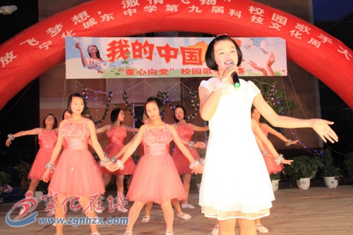 ??? 晚會在七(12)班鄭文俊、曹連洪聲情并茂的合唱聲《中國夢》中拉開帷幕。選手們簡單明快的曲調,風格迥異的唱法,流露著青春飛揚的旋律。《老師》《一起吃苦的幸福》《夢的眼睛》《Big big world》……一個個節目精彩紛呈,令人心曠神怡。八(3)班李圣、謝楚桐合唱的一曲《美麗的中國我的家園》,飽含著莘莘學子對祖國母親濃濃的愛。《老師》《有形的翅膀》《海闊天空》《櫻花草》等演唱聲情并茂,一次次將晚會推向高潮。晚會在七(9)班王錦媛等同學合唱的《城東中學的日子》中緩緩落下帷幕。
