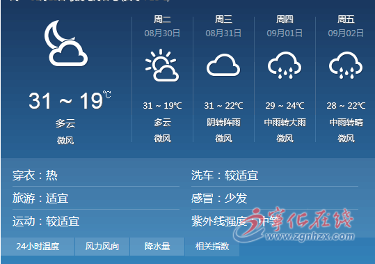 具體預報,30日:多云,T19-31℃;31日:多云間陰,有陣雨,T19-31℃;9月1日:中雨轉大雨,T24-29℃;9月2日:中雨轉晴,T22-28℃。(羅 鳴)