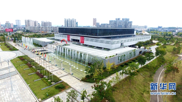 寧化世客中心外廣場,噴泉、綠樹環繞。肖和勇 攝